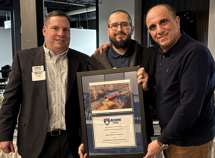 The Waterford Covered Bridge Rehabilitation has been named Project of the Year by the American Society of Highway Engineers’ Franklin chapter. HRG accepted the award last night and shared a brief presentation about the project, which involved repairing and reusing portions of this historic bridge wherever possible while providing the structural integrity to handle modern highway loads. This was accomplished with a unique solution: the addition of a structurally independent floor system that absorbs the vehicle loads without support from the truss and roof.